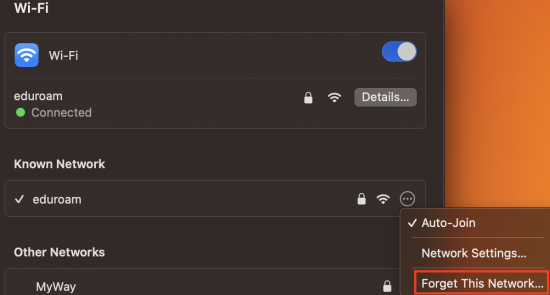 - Tunnetut verkot / Known Networks kohdasta valitse verkko jonka haluat unohtaa, klikkaa kolmen pisteen painiketta ja valitse Unohda tämä verkko / Forget This Network…