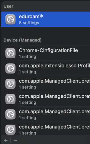 - Täältä sinun pitäisi löytää eduroam -niminen ”laite”, valitse se ja sen jälkeen klikkaa ikkunan alaosasta löytyvää miinus (-) -painiketta ja sen jälkeen Remove / Poista.